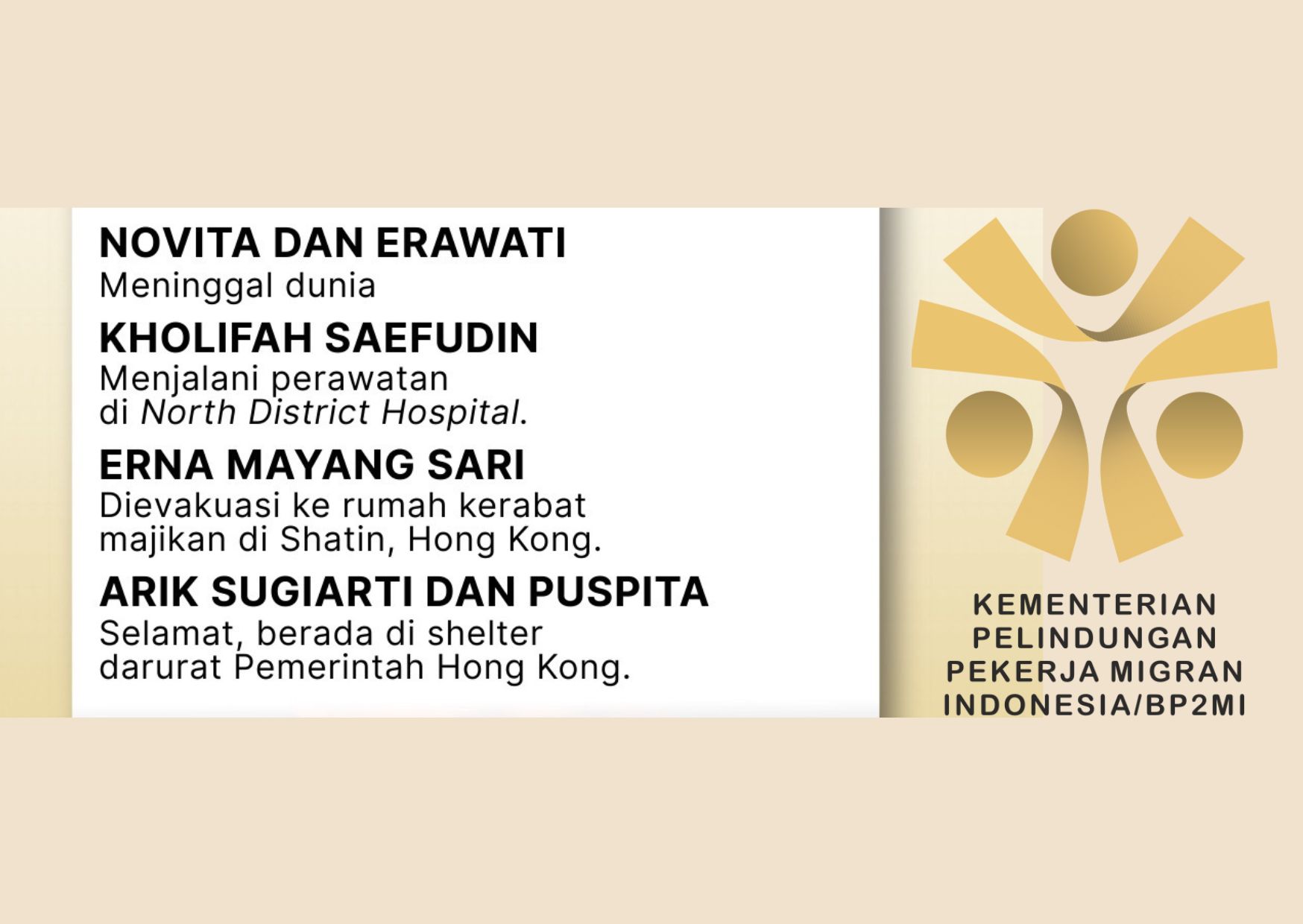 Kementerian Pelindungan Pekerja Migran Indonesia (KP2MI) merilis data korban kebakaran besar yang melanda tiga blok apartemen di Wang Fuk Court, Tai Po, Hong Kong, sekitar pukul 14.51 waktu setempat pada Rabu, 26 November 2025.