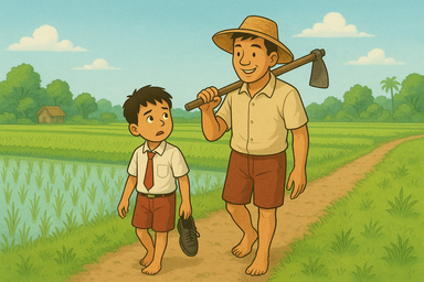Ain menggembungkan pipinya. “Tapi, Pak… kalau aku terbiasa pakai sepatu terus, nanti aku jadi malas nyeker. Kalau udah malas nyeker, nanti aku malas juga bantu Bapak ke sawah.”